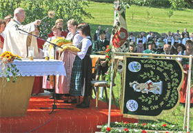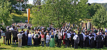 100-Jahr-Feier mit Ehrungen und Standartenweihe Achenmühle (pil) – Als letzter Traditionsverein in der Gemeinde kann nun auch die Schützengesellschaft (SG) Achenmühle „Flagge zeigen“. Quasi als Krönung des Festwochenendes anlässlich der 100-Jahr-Feier weihte Pfarrer Georg Gilgenrainer am Sonntag die neue Vereinsstandarte. Bei strahlendem Sonnenschein hatten sich nach Schätzung der Organisatoren mehr als tausend Teilnehmer zu dem stimmungsvollen Gottesdienst unter freiem Himmel versammelt. Unterstrichen wurde der festliche Rahmen der Veranstaltung zusätzlich durch die zahlreichen Fahnenabordnungen von Ortsvereinen und Schützengesellschaften aus der Umgebung. Pfarrer Gilgenrainer hatte in seiner Predigt unter anderem den Stellenwert des Vereinssports für die Gesellschaft hervorgehoben; schon junge Menschen lernten dort nicht nur das Siegen sondern auch das „Verlieren Können“. Ohnehin zeigen die Achenmühler Schützen großes Engagement für die Jugendarbeit, wie Schützenmeister Anton Posch bereits am Tag zuvor beim Festabend vor rund 450 Gästen ausgeführt hatte: Seit Februar werden unter der Regie von Fritz Kühnle, Christian Steiner und Christian Lechner neue Schüler- und Jugendgruppen aufgebaut; zwölf Jungschützen sind derzeit aktiv. Und in den vergangenen Jahren waren Melanie Kühnle und Fritz Kühnle jeweils in ihren Altersklassen bei den bayerischen Meisterschaften angetreten.