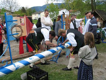 Buntes Familienfest im Achenmühler Kindergarten Achenmühle (pil) - Giraffen, Elefanten, Spatzen, Mäuse und - "nomen est omen" - ein Zwergerlpaar sowie eine kleine Mühle schmücken den neuen Maibaum, der im Achenmühler AWO-Kindergarten "Zwergerlmühle" gut zehn Meter in die Höhe ragt. Für die Schilder hatte Brigitte Brunner aus Lauterbach zu Farbe und Pinsel gegriffen. Natürlich war das Traditionsstangerl vorher verzogen worden: Lauterbacher Trachtler hatten es in einer Nacht-und Nebel-Aktion vom Grundstück der Familie Schauer gestohlen, die den Baum gestiftet hatte. Nach intensiven Verhandlungen mit den Trachtler-Kindern gestanden die Mühlen-Zwergerl den "Dieben" und ihren Geschwistern schließlich freie Kost beim Maifest zu. Kräftigen Applaus ernteten die Mädchen und Buben für ihre Tänze um den Maibaum; Geschicklichkeit war ebenfalls gefragt beim Spiele-Parcours mit Ballwerfen und Zweier-Sackhüpfen. Von seinem Leben im Wald mit all den Tieren und Pflanzen berichtete ein Troll. Das Waldwesen schilderte den Kindern, um wie viel spannender doch ein Spiel in der Natur anstatt am Computer sei. Zur großen Freude von Kindern, Eltern und Kindergarten-Team spielte selbst der Wettergott mit: Abgesehen von ein paar Regentropfen hielten die himmlischen Schleusen bis zum Schluss des Familienfestes dicht. 14. Mai 2004 "Jeder ist anders" als Motto