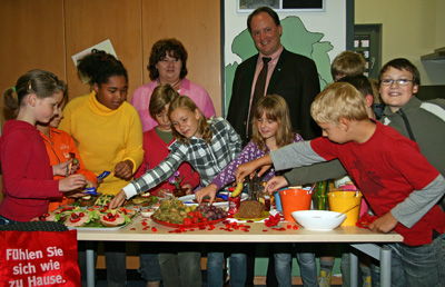 Mit Sprechchören, afrikanischen Gesängen und einem Hexentanz begleiteten die Mädchen und Buben aller Klassen den täglichen Rundgang „ihres“ Häuptlings samt Schirmträger und Herold durchs Dorf, wo man sich allenthalben auf das Fest der Geburt des Gottessohnes vorbereitet. Als es schließlich soweit ist, braucht das Oberhaupt zwar einige Zeit, um den Christengott zu verstehen – hilft aber schließlich sogar mit seinem Regenschirm aus. Bei den Vorbereitungen hatte nicht nur die Theatergruppe unter Leitung von Konrektor Franz Stadler alle Hände voll zu tun gehabt; die musikalischen Einlagen hatte Musiklehrerin Kerstin Selmayr mit ihren Schülern einstudiert, und die Viertklassler waren zudem fürs Bühnenbild zuständig. 28. Dezember 2004 Dem Cholesterin zu Leibe rücken