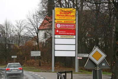 An der Werbetafel scheiden sich die Geister Ampel soll Verkehrssituation an Einmündung entschärfen Thansau (pil) - Erst vor wenigen Tagen ist der neue Lebensmittelmarkt in Thansau eröffnet worden und findet regen Zuspruch bei den Bürgern. An der Werbetafel allerdings, die vis-à-vis zu Füßen der Kirche aufgestellt wurde, scheiden sich offenkundig die Geister. So manchem erscheint die neun Meter hohe beleuchtete Werbeanlage zu mächtig fürs Ortsbild. Der Bürgerblock monierte bei der jüngsten Gemeinderatssitzung außerdem, dass das Vorhaben nicht vorab im Gemeinderat zur Sprache gekommen sei. Bürgermeister Christian Praxl hatte den Vorgang nach eigenen Angaben im Verwaltungsweg genehmigt. „Es war Eile geboten.“, begründete er diesen Schritt. Auch seien bei ihm wegen der zugegebenermaßen großen Anlage, die im übrigen aber nicht höher sei als die Tafel an der Tankstelle einige hundert Meter weiter südlich, bislang keinerlei Beschwerden eingegangen. Weiter verschärft hat sich mit dem Discounter die Verkehrssituation an der Kreuzung Rosenheimer/Fabrik-/Taubenstraße. Der Gemeindechef sicherte zu, bei den zuständigen Stellen mit Nachdruck auf eine Ampelanlage zu pochen. So könnten dann beispielsweise auch die Bewohner des Seniorenheims die Hauptstraße überqueren, ohne den beschwerlichen und ungleich längeren Weg über den Fußgängersteg antreten zu müssen. November 2010